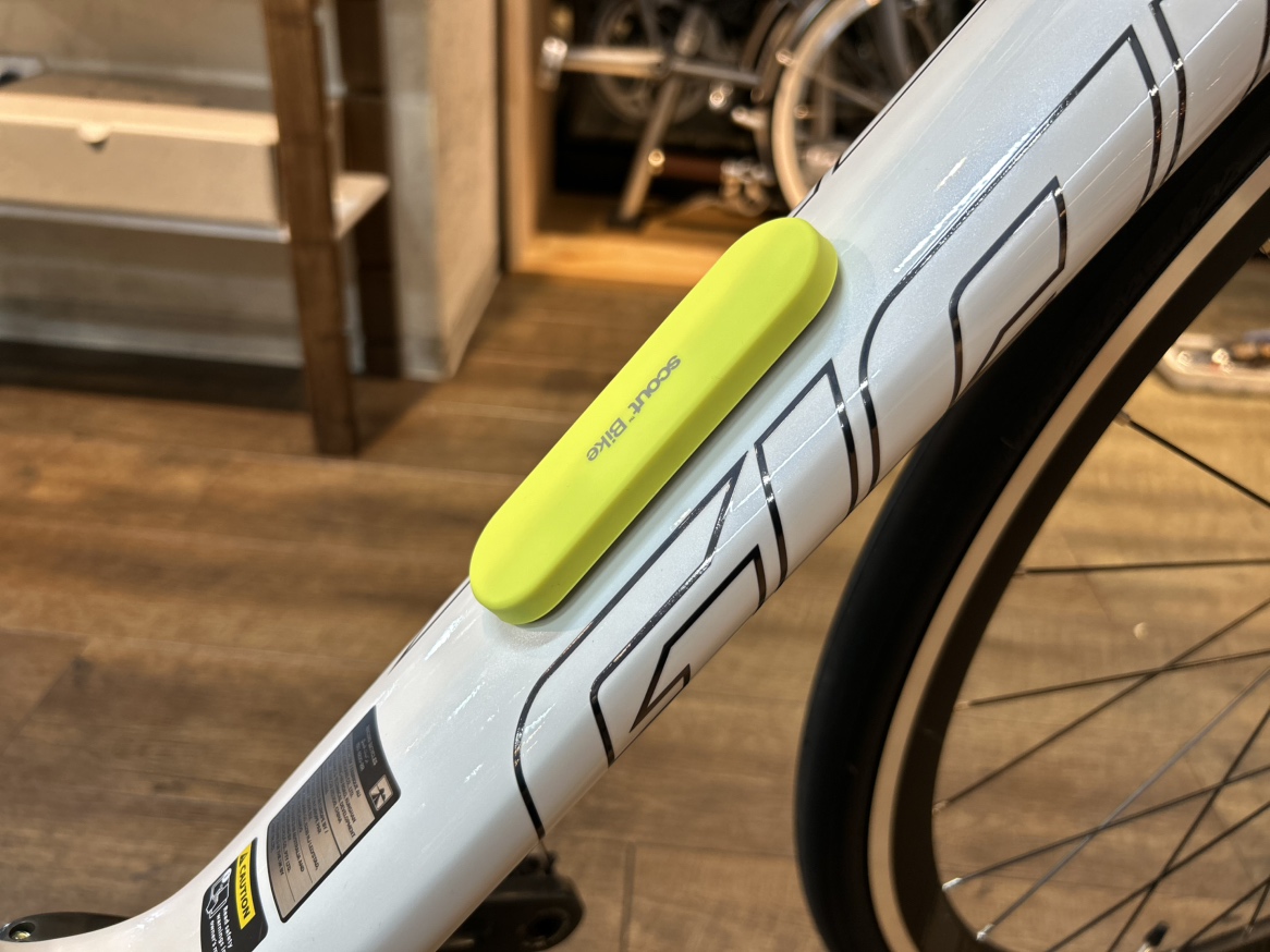黄色のカバーで目立たせたり、ボトルケージの下に取り付け目立たせないようにすることも可能。